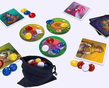 Vous aurez chacun un petit plateau devant vous, symbolisant votre réserve. Au centre de la table, autant de tuiles champignon qu'il y a de joueurs - 1. Sur chaque tuiles sont placées 2 des pierres de couleur (rouge, jaune, bleu, blanche) par tuile.