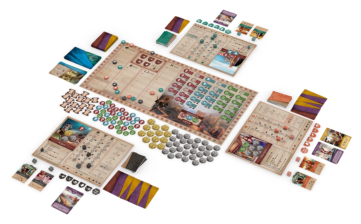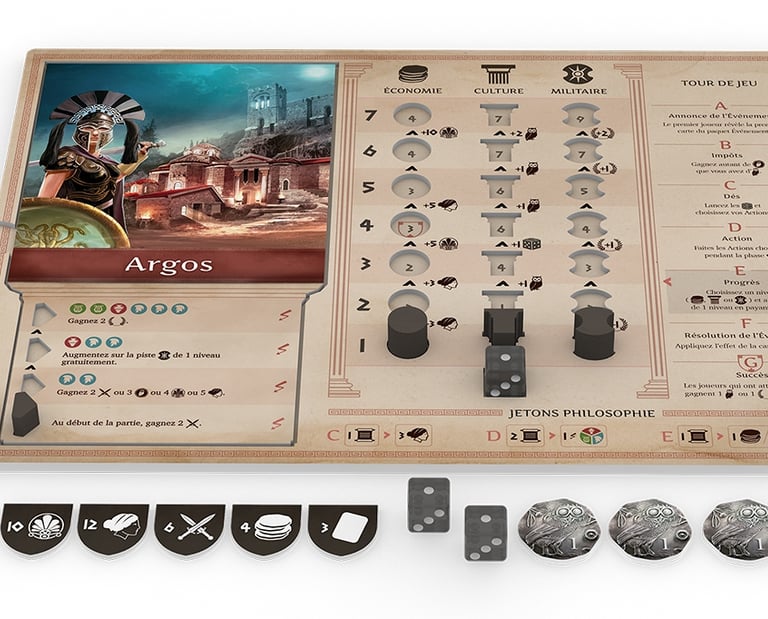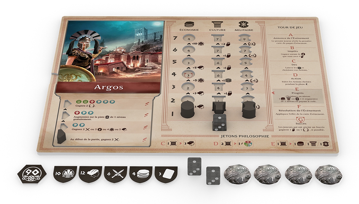 Avancez sur la piste d'Impôts pour récolter les trop rares Drachmes, sur la piste d'Armée pour coloniser et obtenir des jetons Connaissance, et sur la piste de Gloire, pour faire fructifier ces Connaissances.
