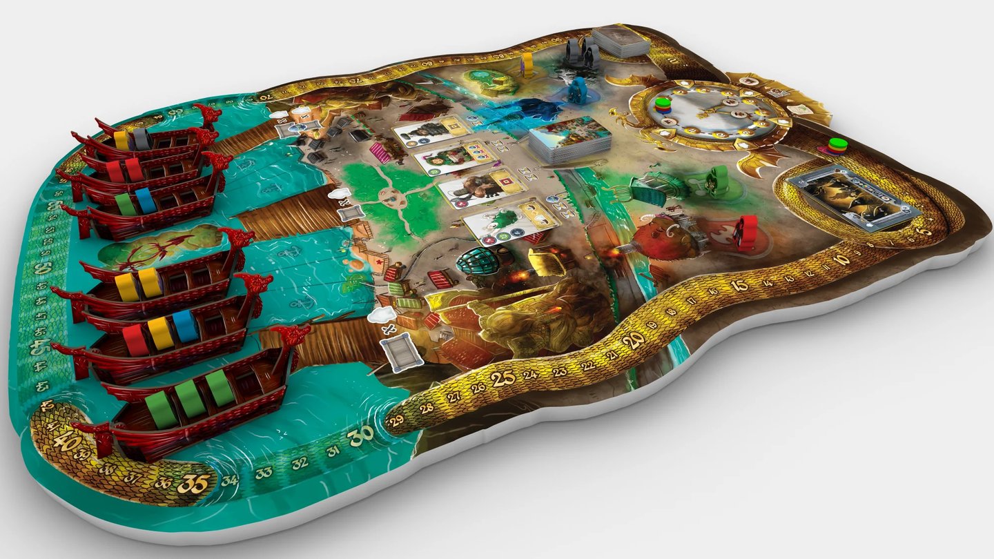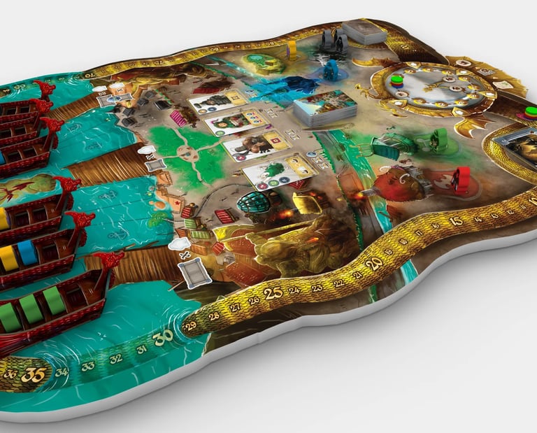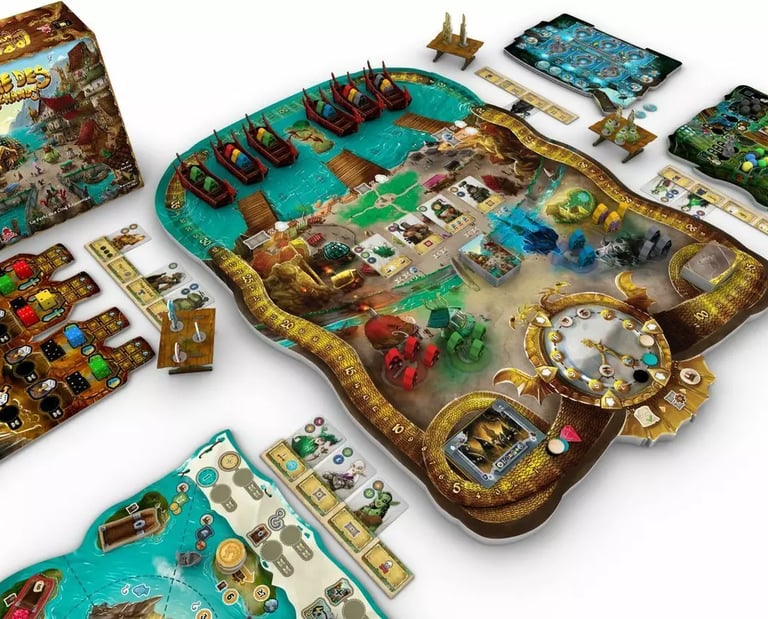 Le jeu de base est fourni avec le plateau de la baie (ville, habitants, 6 bateaux pour les clients) et 4 marchands de départ (L’Alchimiste, la Capitaine, le Forgeron, Le Chronomancien) avec chacun, une figurine et tout le matériel, plateau et éléments 3D, pour produire ses marchandises !