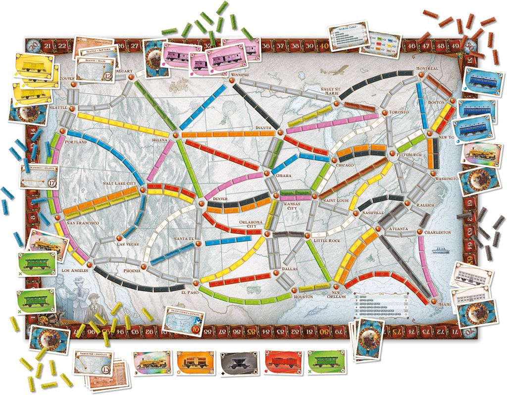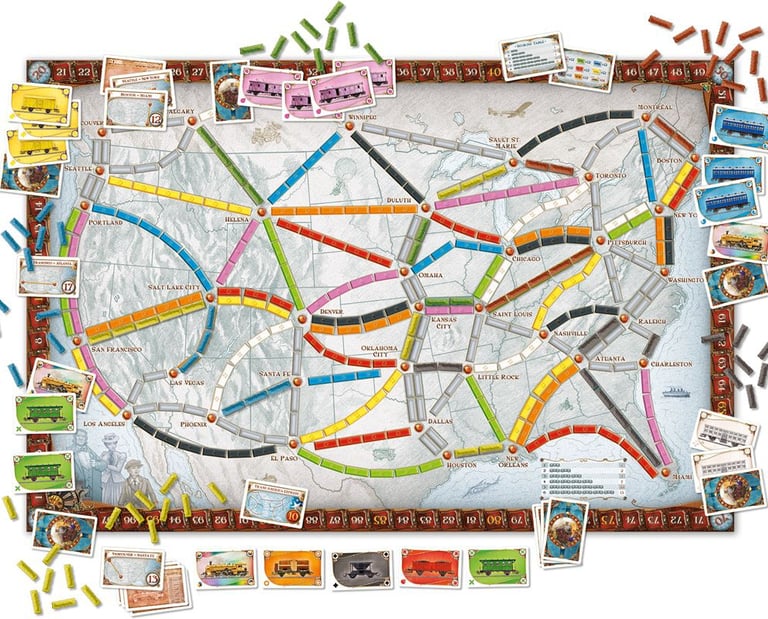 Dans ce jeu de société, vous collectionnez des wagons pour prendre le contrôle de lignes de chemins de fer reliant les différentes villes des Etats-Unis. Plus longues seront vos routes, plus grand sera le nombre de points gagnés.