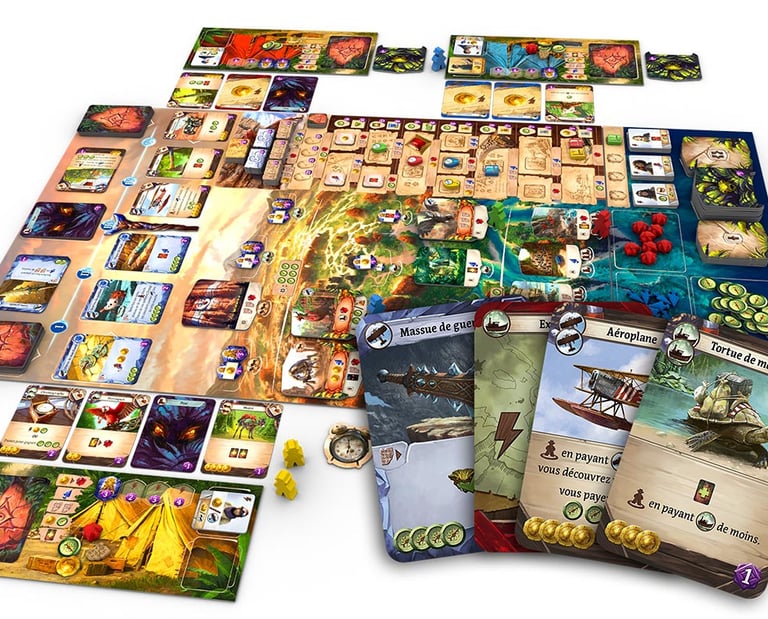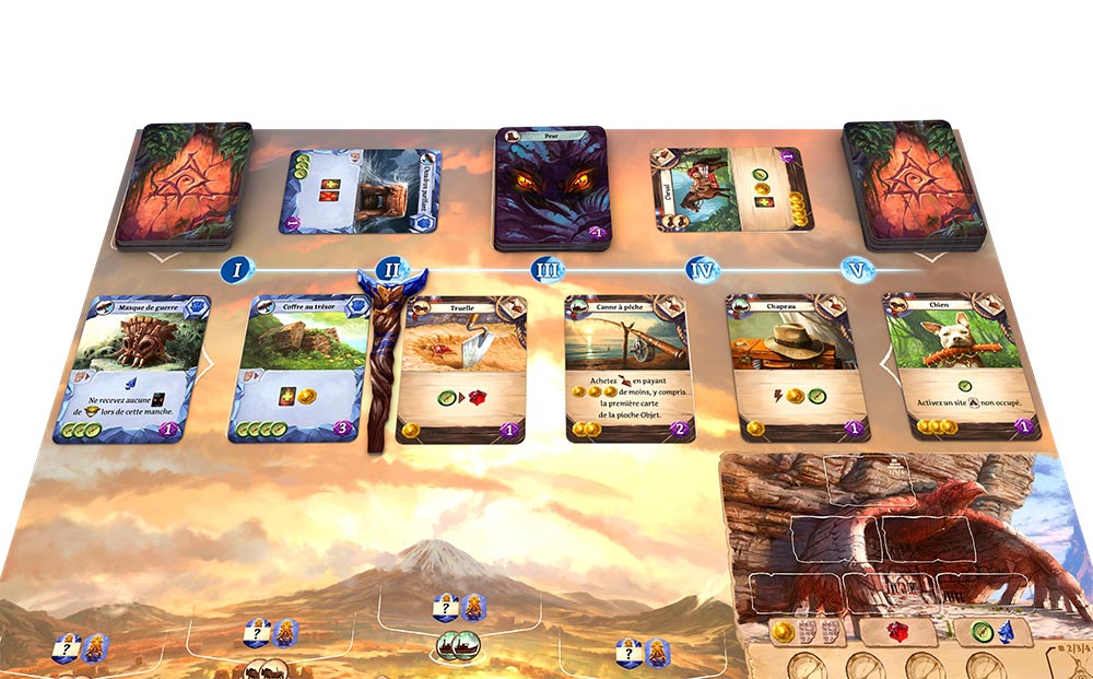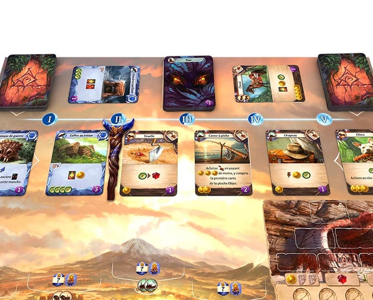 Le jeu prend place sur un plateau de jeu de grande taille recto verso (pour une version avancée avec davantage de challenge) et invite les joueurs à mener leurs actions à hauteur de leurs ressources, en leur laissant une grande liberté de gestion. Contrairement à la plupart des jeux de deckbuilding, les cartes acquises sont directement placées sous la pioche pour en maitriser le flux, et les artefacts sont activables dès l’achat pour des effets aussi immédiats que spectaculaires. Toutes les actions sont susceptibles de rapporter des points de victoire, mais la recherche du Temple Perdu sera particulièrement riche en prestige, pour le plus audacieux.