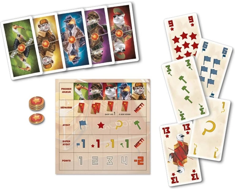 La phase de plis : Déterminez vos coéquipiers, puis tour à tour, suivez la couleur de la carte jouée par le premier joueur et tentez de remporter le pli (ou pas) en déposant une carte de plus grande valeur, un atout ou un superatout. Attention, selon les conditions de victoire que vous aurez préalablement déterminées, il vous faudra parfois perdre le pli pour éviter de remporter des points négatifs.