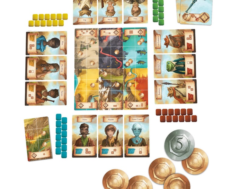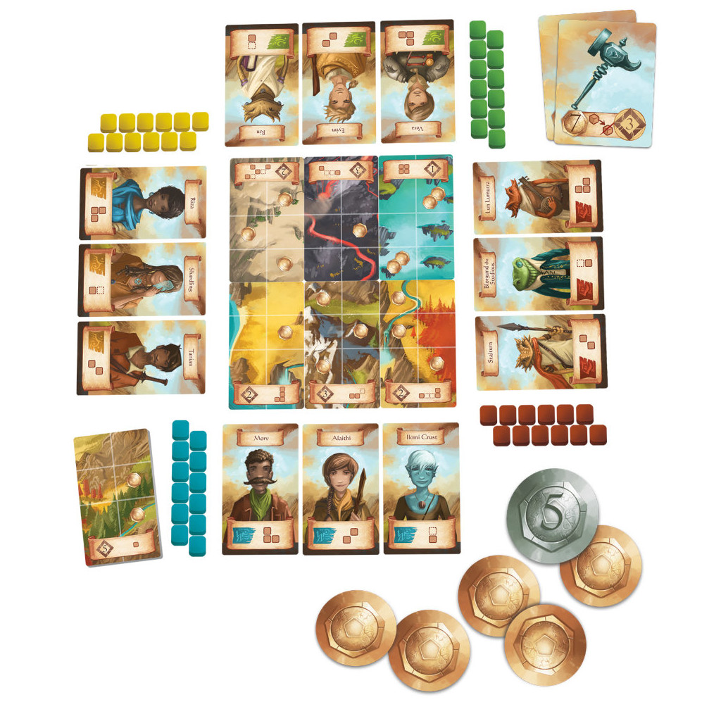 Le côté opposé de chaque carte représente un paysage divisé en six carrés, et deux rangées de trois de ces cartes sont placées au centre de la zone de jeu pour former le tableau. Lorsqu’un joueur a dix aventuriers dans son groupe, le jeu se termine et le joueur ayant le plus de points gagne.