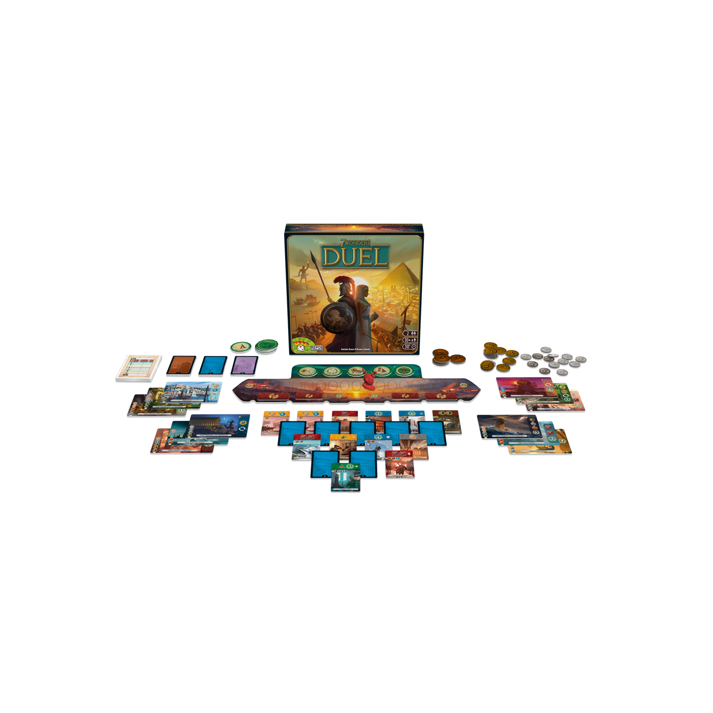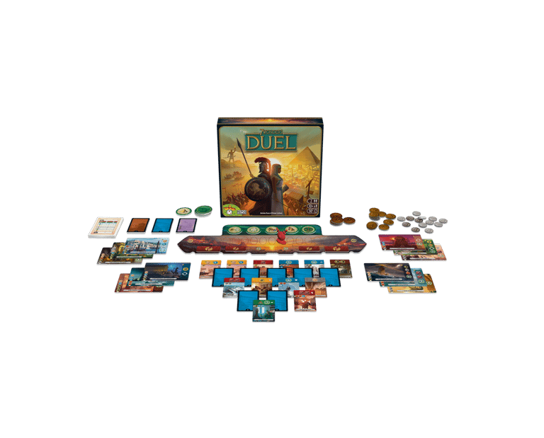 7 Wonders - Duel propose un tout nouveau système de partage des cartes, 3 conditions de victoire, des progrès scientifiques, un système militaire original et 12 merveilles à combiner pour des parties addictives et toujours renouvelées.