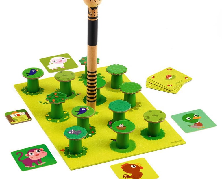 On place les arbres sur le plateau de jeu et une carte animal de chaque côté du plateau. Chaque joueur à son tour mémorise l’emplacement des 4 animaux et met le bandeau sur ses yeux.