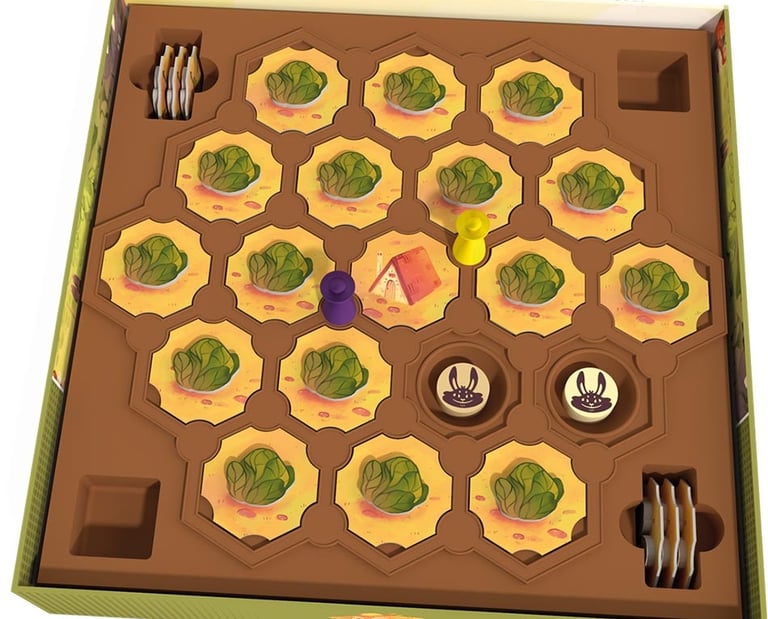 La nuit : • Les jardiniers mettent leurs lunettes. • À tour de rôle, chaque lapin : • Soulève la tuile sous laquelle son jeton est caché et le récupère. • Replace la tuile sur la face Chou mangé. • Puis se déplace en ligne droite jusqu’au premier chou sur son trajet. • Il cache alors son jeton sous ce chou et c’est au tour du second lapin de faire la même chose.