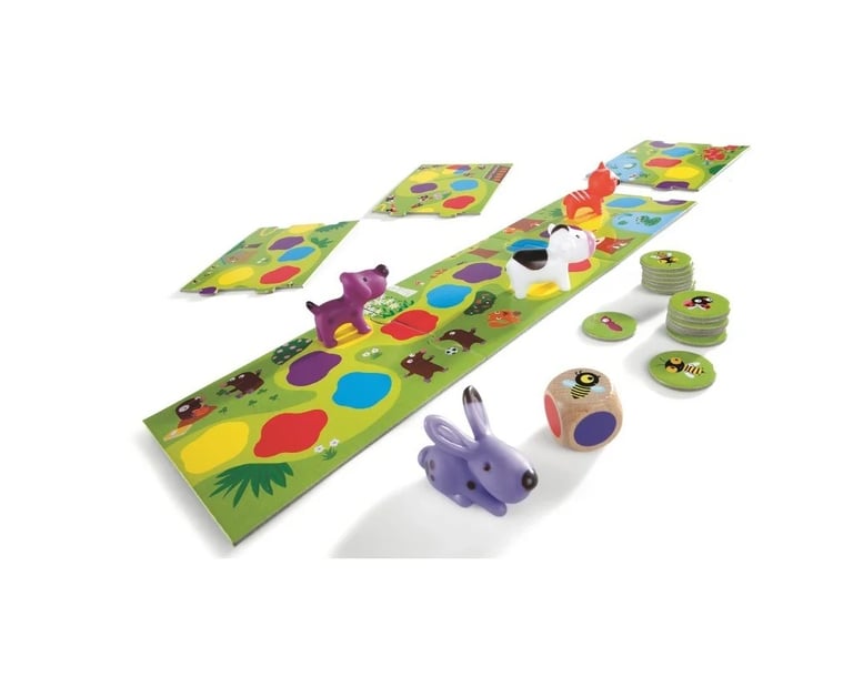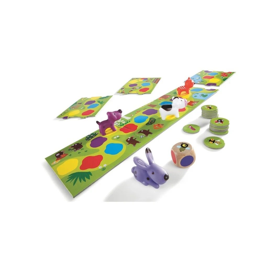De petits animaux se promènent tout au long du chemin. Lance le dé, le dé indique la couleur rouge: le petit chien peut alors avancer jusqu'à la prochaine case rouge. Quel animal arrivera le premier au bout du chemin?