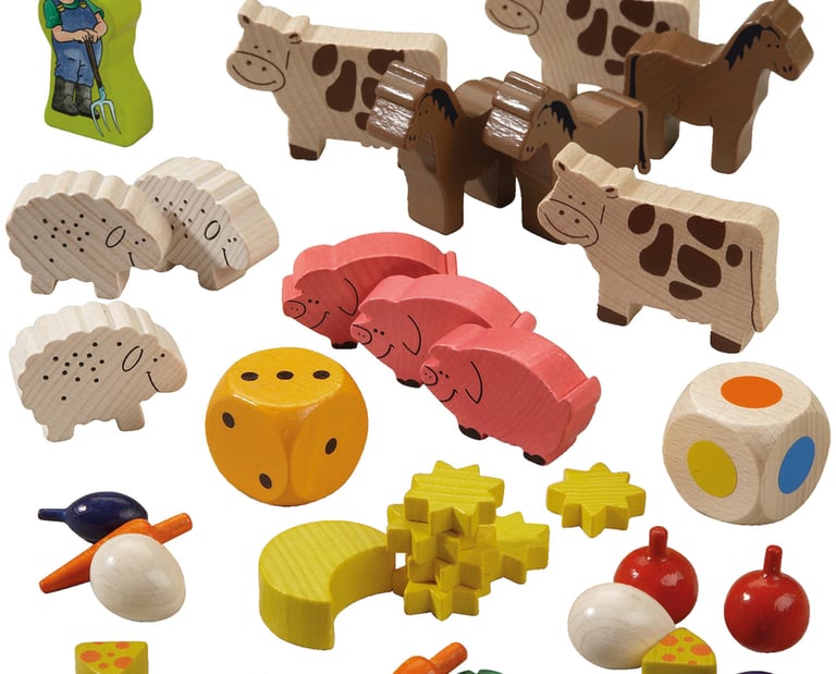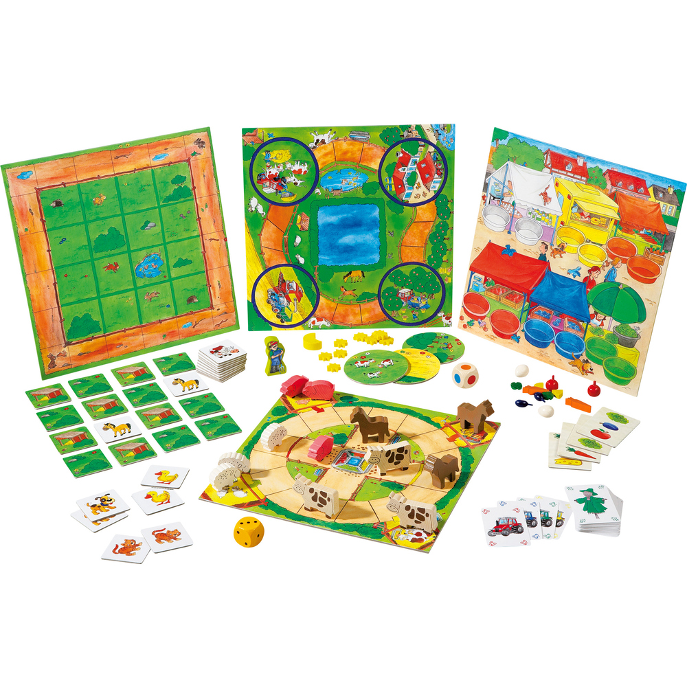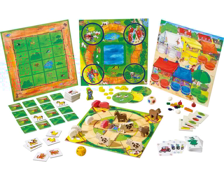 A l'étable : - Une version revisitée du classique jeu des Petits chevaux - Travail à la Ferme : Un jeu coopératif joué avec un dé multicolore