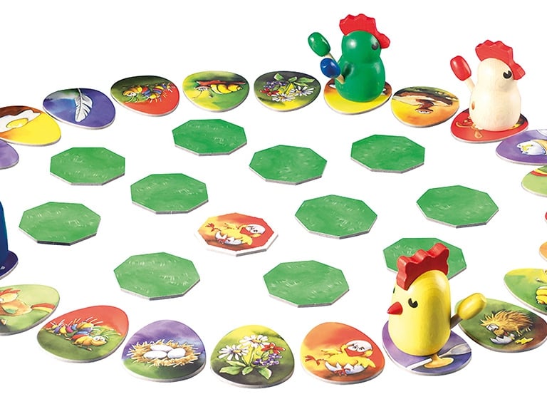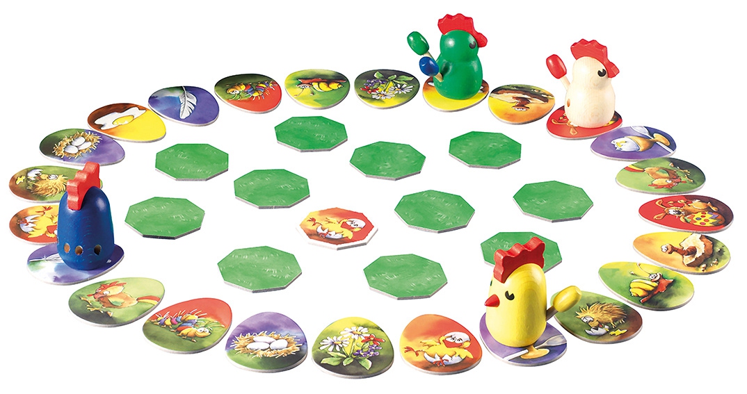 Dans le jeu de mémoire Pique Plume, les poules évoluent sur des œufs, sûrement pour rester discrètes. Ces œufs possèdent différentes illustrations qui se retrouvent sur les tuiles poulailler. Ces dernières sont disposées face cachée au centre de la piste. Car comme le veut le diction : "Parcours en œufs, poulailler au milieu". Bref, pour avancer on choisit une case œuf et on retourne une tuile poulailler, si cette dernière est identique, on peut avancer.